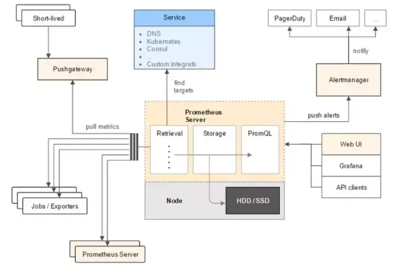 从用户的角度看,Prometheus 的整体架构设计参考了 Google BorgMon,系统具有高度的灵活性,围绕其开放性现在也慢慢形成了一个生态系统。具体来说,Prometheus 使用的是 Pull 模型,Prometheus Server 通过 HTTP 的 Pull 方式到各个目标拉取监控数据。HTTP 协议的支持能够更加方便的进行定制化开发,服务注册、信息采集和数据展示均支持多种形式 / 开源软件。