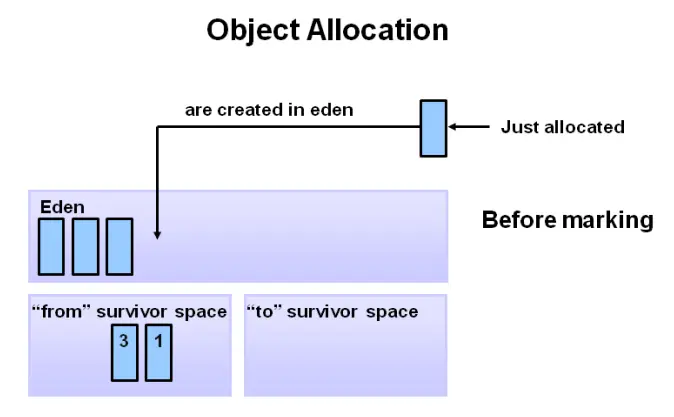 Step1. 新分配的对象进入 Eden 空间,两个 Survivor 开始时都是空的: