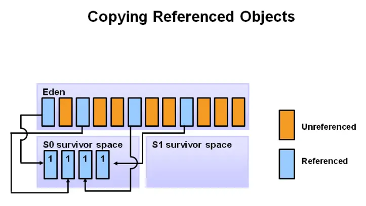 Step3. 仍然存活的对象移至 Survivor 空间,年龄为1,不再引用的删除,清理 Eden 空间: