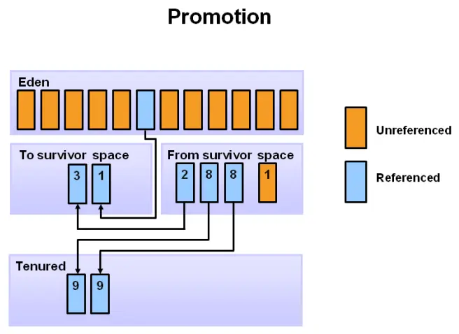 Step6. 多次 Minor GC 触发后,部分存活对象的年龄超过了年轻代的年龄阈值(这里假设为8),晋升为老年代: