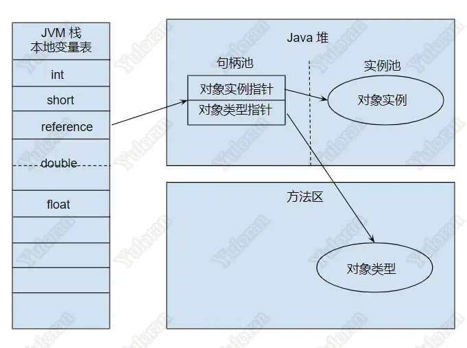 Java 程序通过栈上的 reference 来操作堆上的具体对象。由于 JVM 规范只规定了 Reference 类型是一个指向对象的引用,并没有定义这个引用该通过何种方式去定位、访问堆中的对象的具体位置。目前主流的访问方式有使用句柄和直接指针两种: