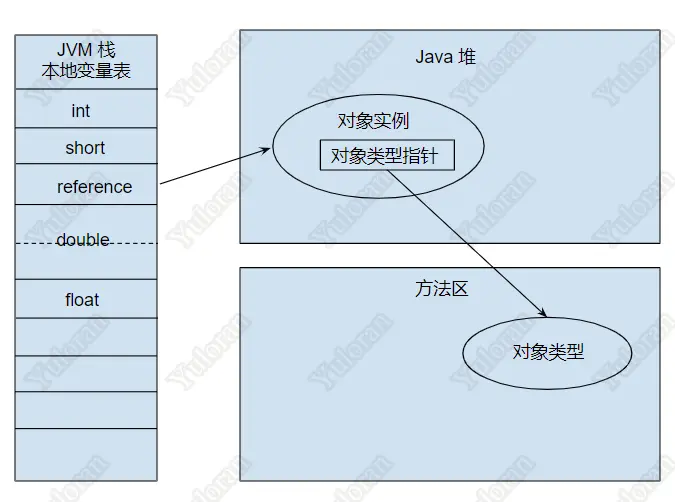 - 可以直接或间接从此引用查到对象所属数据类型在方法区中存储的类型信息。