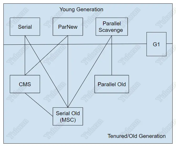 所有新对象分配和变老的地方。年轻代用完时,将会触发一次 Minor Garbage Collection。GC 后,仍然存活的对象会变老并最终进入老年代。年轻代使用 "标记-复制" 法进行 GC。