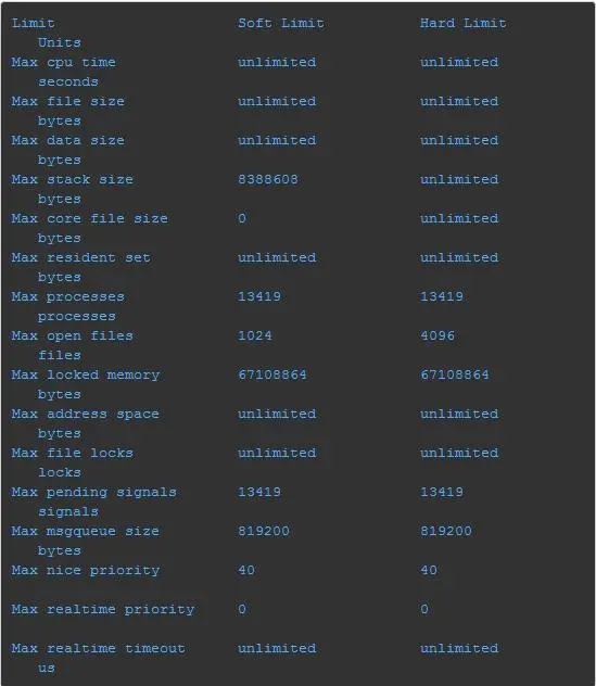 1 ./proc/pid/limits 描述着 linux 系统对对应进程的限制,下面是一个样例: