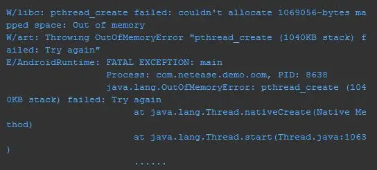 可以看出 错误信息与我们线上遇到的 OOM 二吻合:"pthread_create (1040KB stack) failed: Out of memory" 另外 ART 虚拟机还有一个关键 Log:“pthread_create failed: clone failed: Out of memory”,后面会用于问题定位及解释。