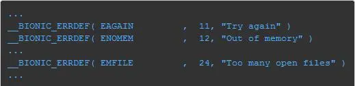 我们线上的OOM 一的错误信息"ashmem_create_region failed for 'indirect ref table': Too many open files",与此处打印的信息吻合。"Too many open files"的错误描述说明此处的 errno(系统全局错误标识)为 24(见图 [3-10] 系统错误定义 _errdefs.h)。由此看出我们线上的 OOM 一是由于文件描述符数目已满,ashmem_create_region 无法返回新的 FD 而导致的。