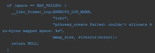 pthread_create失败时抛出 OOM 的错误信息为"pthread_create (%s stack) failed: %s".其中详细的错误信息由 pthread_create 的返回值(错误码)给出。错误码与错误描述的对应关系可以参见 bionic/libc/include/sys/_errdefs.h中的定义。文中 OOM 二的具体错误信息为"Out of memory",就说明 pthread_create 的返回值为 12。