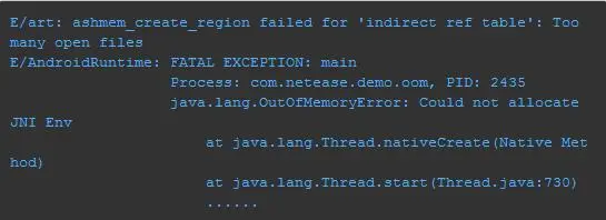 可以看出,此 OOM 发生时的错误信息确与线上发现的 OOM 一的“Could not allocate JNI Env” 吻合,因此线上上报的 OOM 一 可能 就是由 FD 数超限导致的,不过最终确定需要到线上进行验证 (下一小节)。此外从 ART 虚拟机的 Log 中看出,还有一个关键的信息 “ art: ashmem_create_region failed for 'indirect ref table': Too many open files”,后面会用于问题定位及解释。
