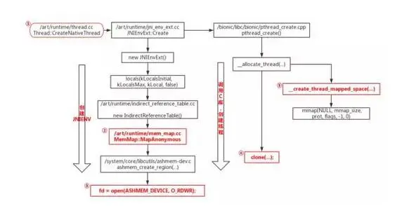 2. 图中节点②和③是创建 JNIENV 过程的关键节点,节点②/art/runtime/mem_map.cc 中 函数 MemMap:MapAnonymous 的作用是为 JNIENV 结构体中Indirect_Reference_table(C 层用于存储 JNI 局部 / 全局变量)申请内存,申请内存的方法是节点③所示的函数ashmem_create_region(创建一块 ashmen 匿名共享内存, 并返回一个文件描述符)。节点②代码节选如下: