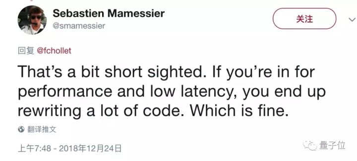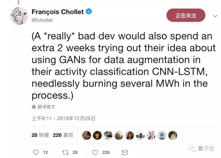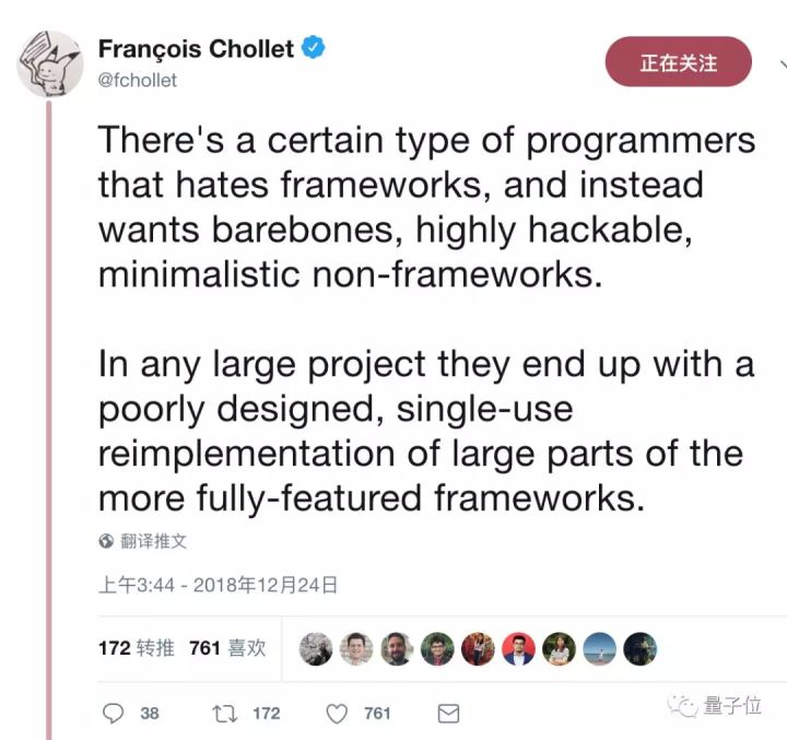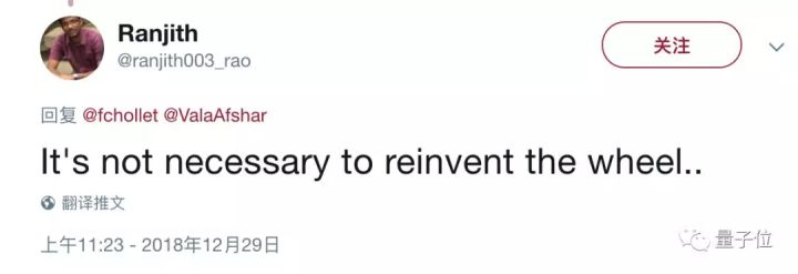 作为Keras这个高级框架的作者和布道者,Chollet对重复造轮子这种行为,更是持之以恒地批判。