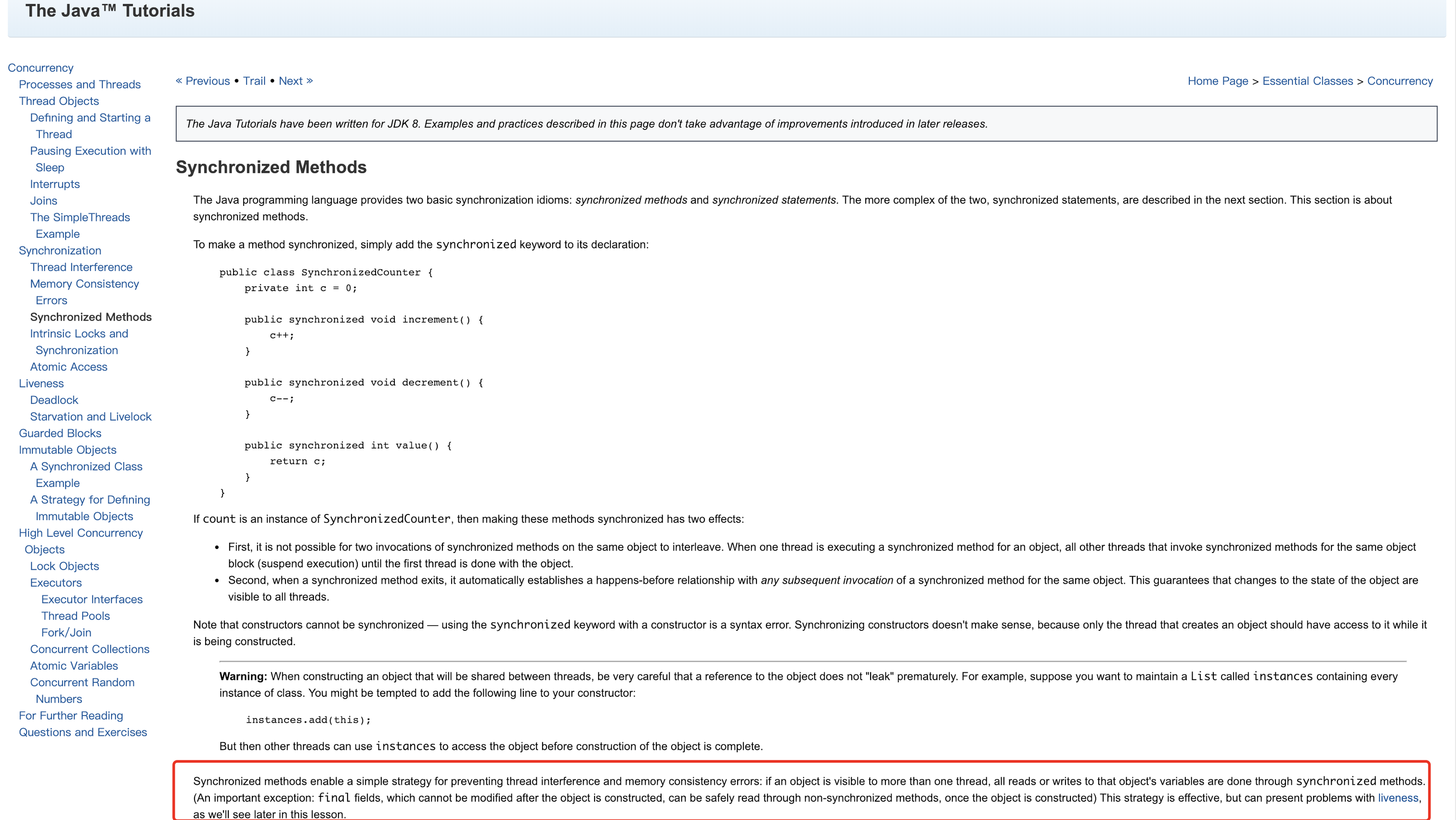 高并发详解之 synchronize 已注销 2018-12-30 168 阅读1分钟 1 导读 1.1 前置知识 1.2 章节介绍 开发环境 2 synchronize简介 本节大纲 2.1 作用 https://docs.oracle.com/javase/tutorial/essential/concurrency/syncmeth.html