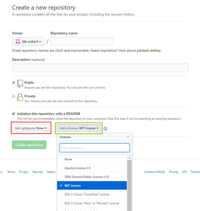 在创建仓库时要注意一点,下图抹茶色框里,开源协议,选择MIT协议。红框里面无所谓选择,如果选择了None后续需要自己配置