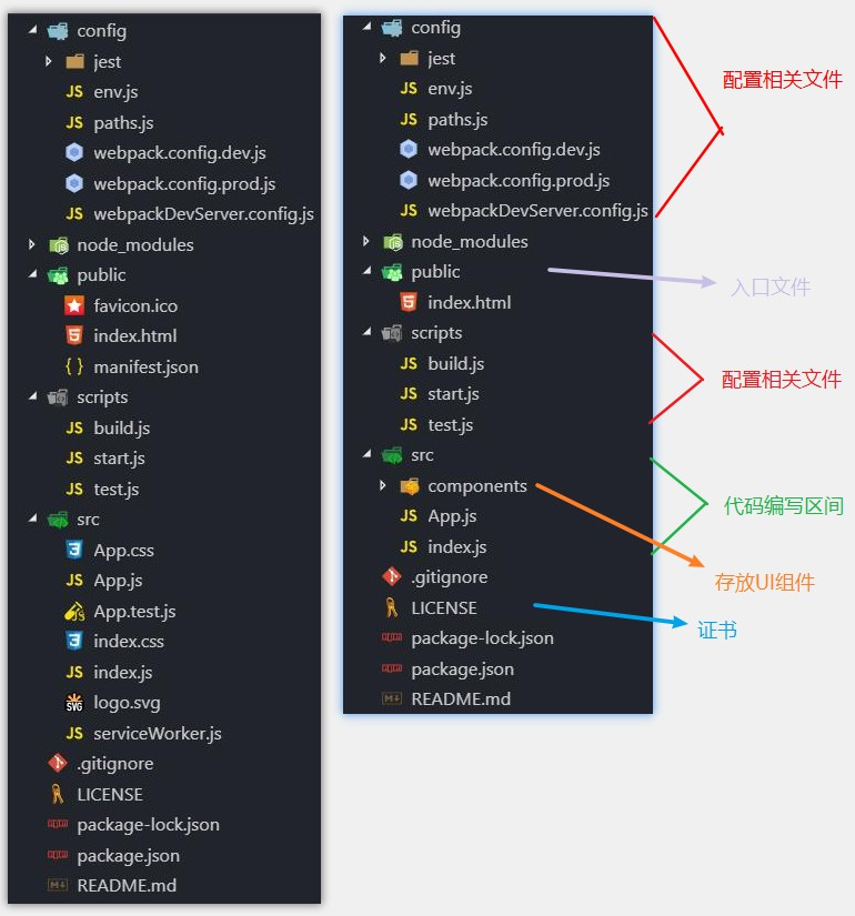 如果你没有执行 npm run eject ,那么请参考上图中重构后的部分,修改 ./public与 ./src 中的文件。