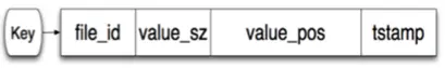 为了解决该问题,bitcask将文件以日志方式追加至bitcask实例(目录)的大文件中,自己管理文件索引,即文件key至在磁盘文件位置以及文件内偏移。beansDB文件元数据格式为: