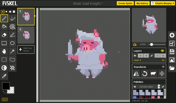 在这个 Jam 期间,Piskel 极大地帮助我们的两个功能是 洋葱皮(Onion skin)和 精灵序列图(spritesheet)导出。