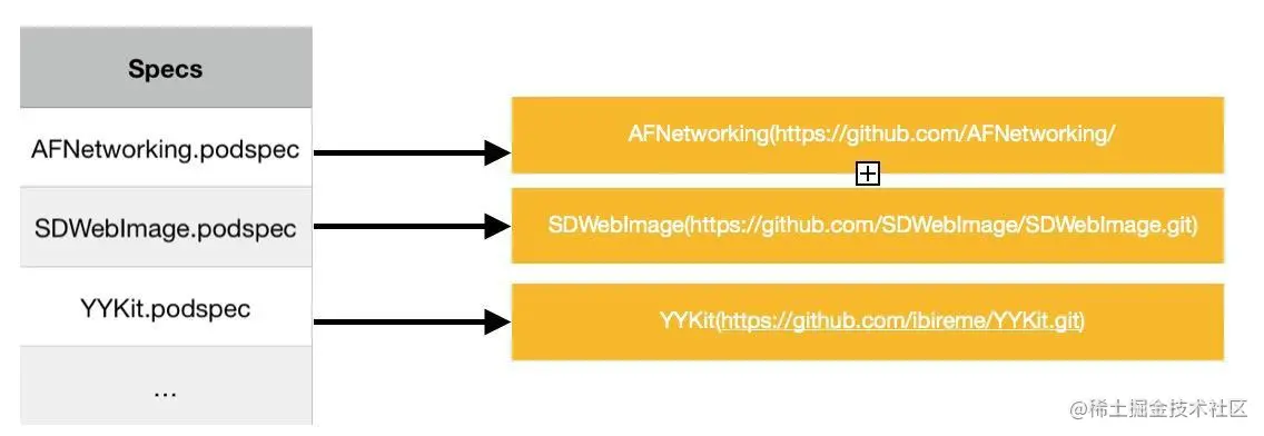 CocoaPods 有一个开源的索引仓库Specs,仓库存放着所有开源库的各个版本的.podspec文件,.podspec文件包含中记录着源码的地址。首次使用CocoaPods时,会将这个文件库克隆到本地~/.cocoapods/repos/master。