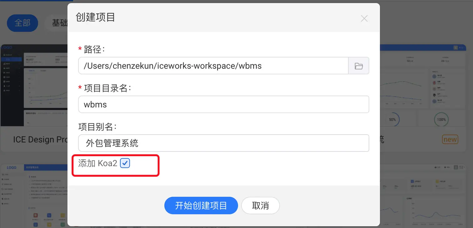 - 打开飞冰,使用ICE Design Pro模板并点击 添加koa2,如下