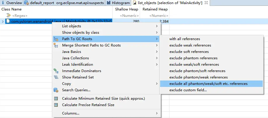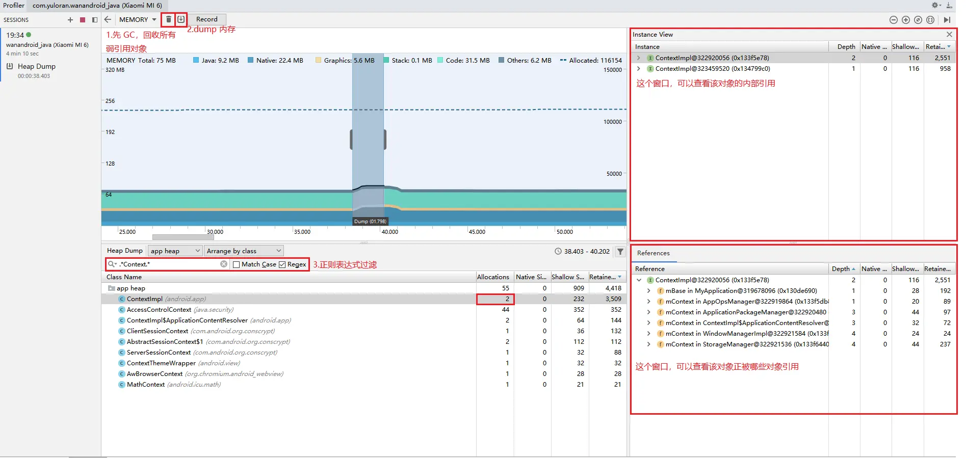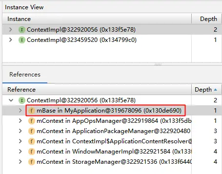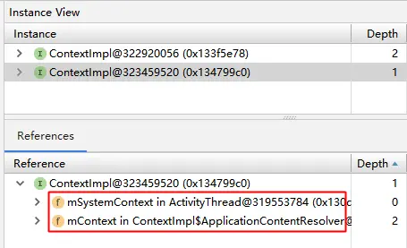 Instance View 窗口可以查看该对象的内部引用,Reference 窗口可以查看该对象被哪些外部对象引用。我们分别查看下这两个 Context 对象正被哪些对象引用: