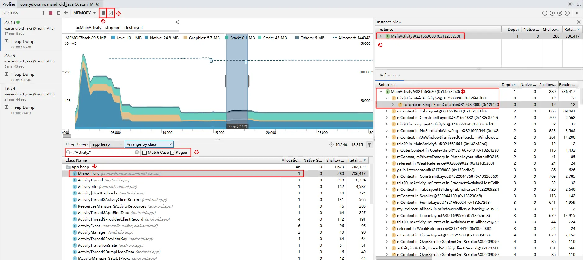 接下来,需要分析具体的内存泄露原因,有两种方法:Android Studio Profiler 和 MAT。