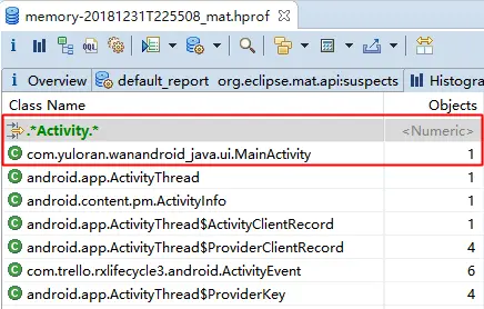 此处我们主要关注 Activities,这是定位应用是否存在内存泄露的切入点。因为 Activity 作为应用与用户的交互入口,绝大多数的内存泄露,最终都会反应到 Activity 上。正常情况下,打开一个 Activity,Activities 计数+1,退出一个 Activity,Activities 计数-1,退出应用,Activities 计数=0。 如果不是,说明你的应用存在内存泄露。显然,上图所示的数据,Activities 为 0,不存在内存泄露。