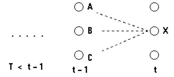- 考虑计算t时刻到达状态X的最可能的路径;这条到达状态X的路径将通过t-1时刻的状态A,B或C中的某一个。因此,最可能的到达状态X的路径将是下面这些路径的某一个