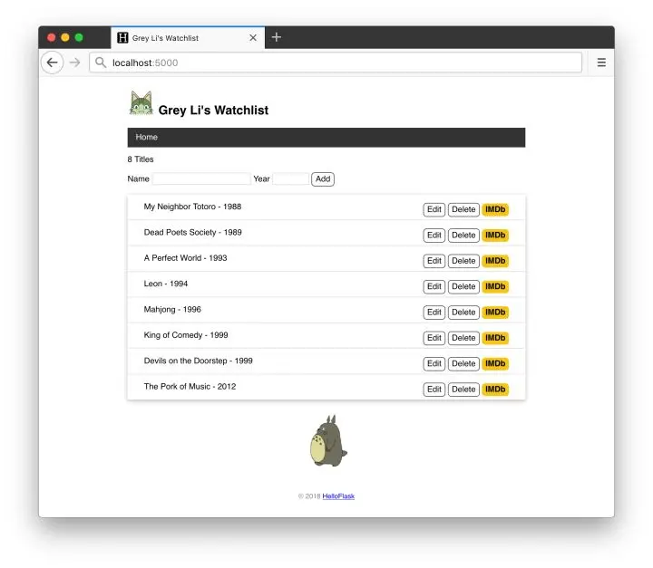 movie_id 变量是电影条目记录在数据库中的主键值,这个值用来在视图函数里查询到对应的电影记录。查询的时候,我们使用了 get_or_404() 方法,它会返回对应主键的记录,如果没有找到,则返回 404 错误响应。