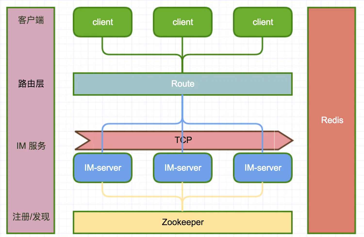 Netty + Google Protocol Buffer构建底层通信。 Redis存放各个客户端的路由信息、账号信息、在线状态等。Zookeeper用于IM-server服务的注册与发现。
