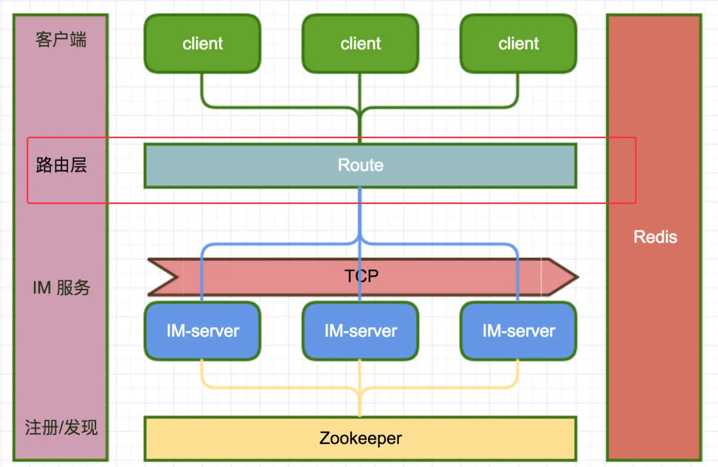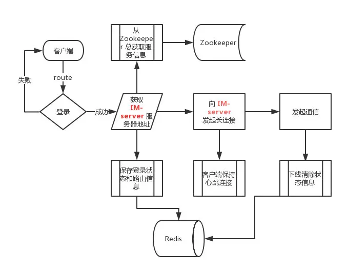 Zookeeper中选择可用IM-server返回给客户端,并保存登录、路由信息到Redis。 - 客户端向