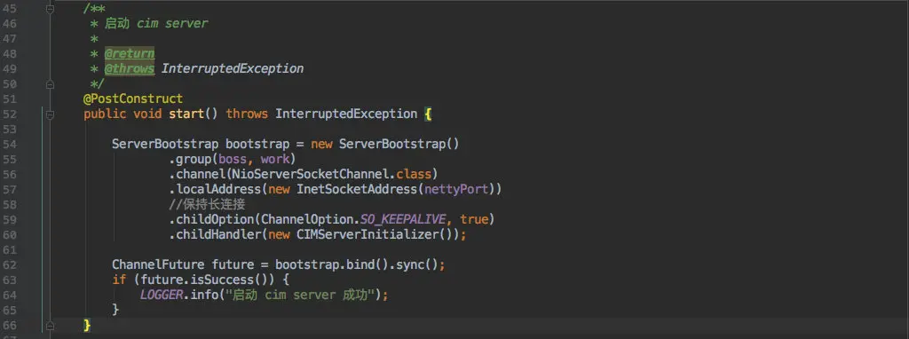 由于是在 SpringBoot 中搭建的,所以在应用启动时需要启动 Netty 服务。