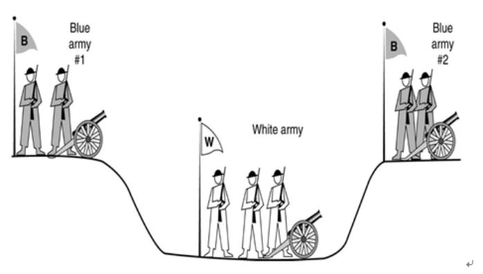 白军驻扎在沟渠里,蓝军和红军分别驻扎在沟渠两边。白军比蓝军和红军中任何一支军队都更为强大,但是蓝军和红军若能同时合力进攻则能够打败白军。蓝军和红军不能够越过沟渠远程地沟通,只能派遣通信兵穿过沟渠去通知对方协商进攻时间。但是通信兵可能会迷路或者被敌军截获,消息被篡改。