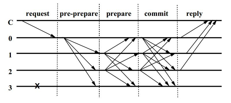 首先客户端发送了一个请求到主节点,之后经典的三阶段协议(three-phase protocol)就拉开了序幕。