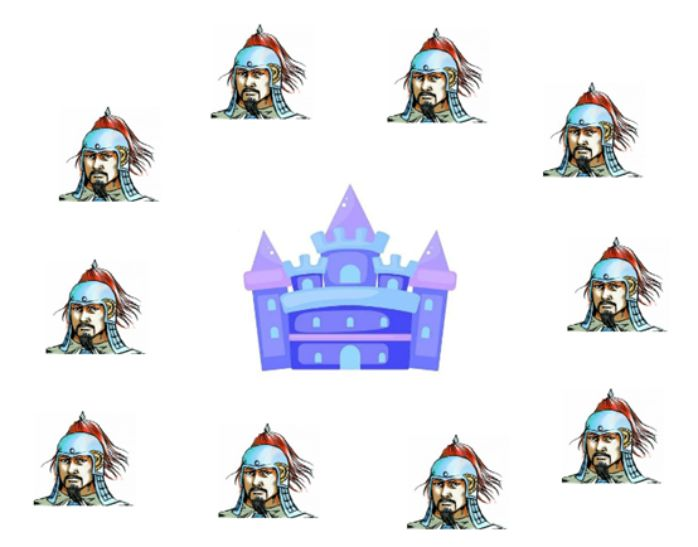 一组拜占庭将军分别各率领一支军队共同围困一座城市。为了简化问题,将各支军队的行动策略限定为进攻或撤离两种。因为部分军队进攻部分军队撤离可能会造成灾难性后果,因此各位将军必须通过投票来达成一致策略,即所有军队一起进攻或所有军队一起撤离。因为各位将军分处城市不同方向,他们只能通过信使互相联系。在投票过程中每位将军都将自己投票给进攻还是撤退的信息通过信使分别通知其他所有将军,这样一来每位将军根据自己的投票和其他所有将军送来的信息就可以知道共同的投票结果而决定行动策略。