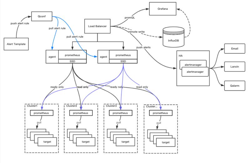 对于自定义业务,让业务自己写告警,统一的配置文件会上报到 QConf。运行在两台 Prometheus 机器上 Agent 会实时的 watch 配置中心 (Qconf) 是否有新的配置生成,如果存在则会 Pull 报警规则,并 reload Prometheus 实例。
