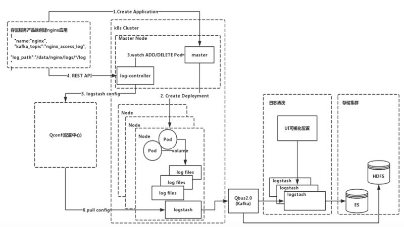 360 在 Kubernetes 集群的每个 Node 节点都会部署一个二次开发的 Logstash,该 Logstash 会定期(每隔十秒或者五秒,时间可配置)去配置中心 (Qconf) 拉取最新的配置。拉取完配置之后,Logstash 会根据最新的配置把相关的的日志收集到公司的 Qbus(对 Kafka 进行包装的产品)中,也就是数据已经进入到 Kafka 了。之后用户可以在 HULK 私有云平台 (内部的私有云平台) 开通 ES 服务,对日志进行检索分析或对其他日志指定数据进行监控。