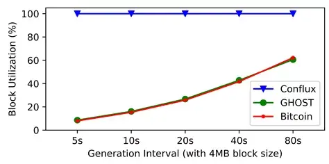 下面有图可以更好地展示优势,这张图展示了4MB大小区块下不同出块时间下被保留区块的数量。Conflux保留了所有区块,比特币和Ghost (以太坊协议改自这个协议) 则由于分叉丢失了大量的区块。
