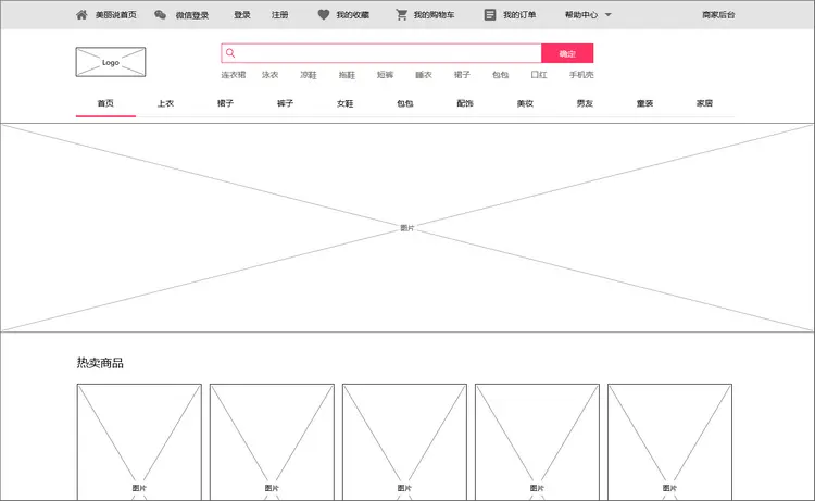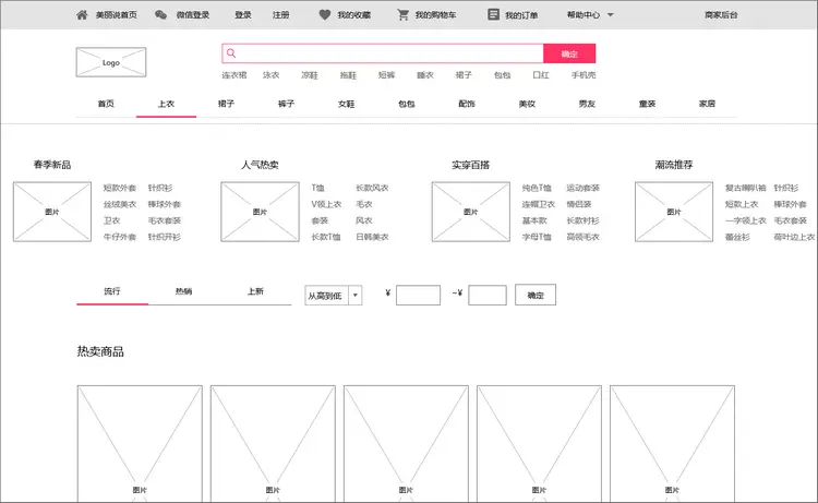 这个原型的主要页面有:首页、上衣、裤子、裙子、登录页面。