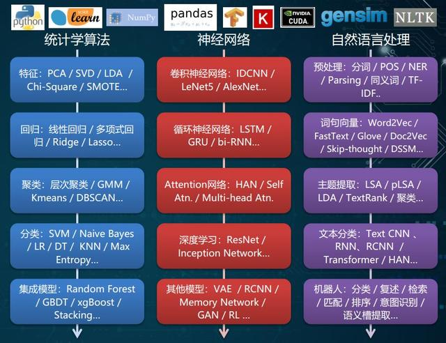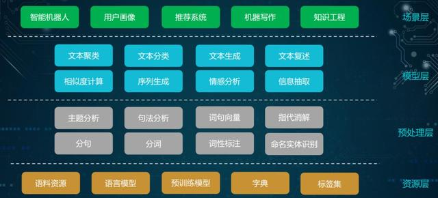 具体来讲,我们从可以承担基本的处理任务(利用一些现有的规则分析、基本算法模型所进行的词性分析、句法分析)发展到可以利用相对复杂的神经网络模型对外提供文本分类、文本聚类、信息抽取等等一些模型服务,再到目前实施的智能聊天机器人(Chatbot)、用户画像、知识工程等高级场景,技术也随之转向了transformer、GAN、强化学习、深度学习网络等能力越来越强、结构越来越复杂的模型。这一过程可以看出来技术在不断的进步。