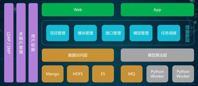 图4为NLP平台工程架构。我们构建了一个支持Python环境的多任务调度微服务架构,从图中可以看到我们利用Mongo、HDFS、ES、MQ等系统构建了相关的数据访问层、模型算法层,在这两层的基础上,在微服务层我们对算法模型进行任务调度管理;外部我们暴露出相关的Web接口和App接口。此外,纵向来看,我们集成了一些权限管理、多租户管理功能,可以对接企业内部的单点登录、身份认证、权限控制等系统。