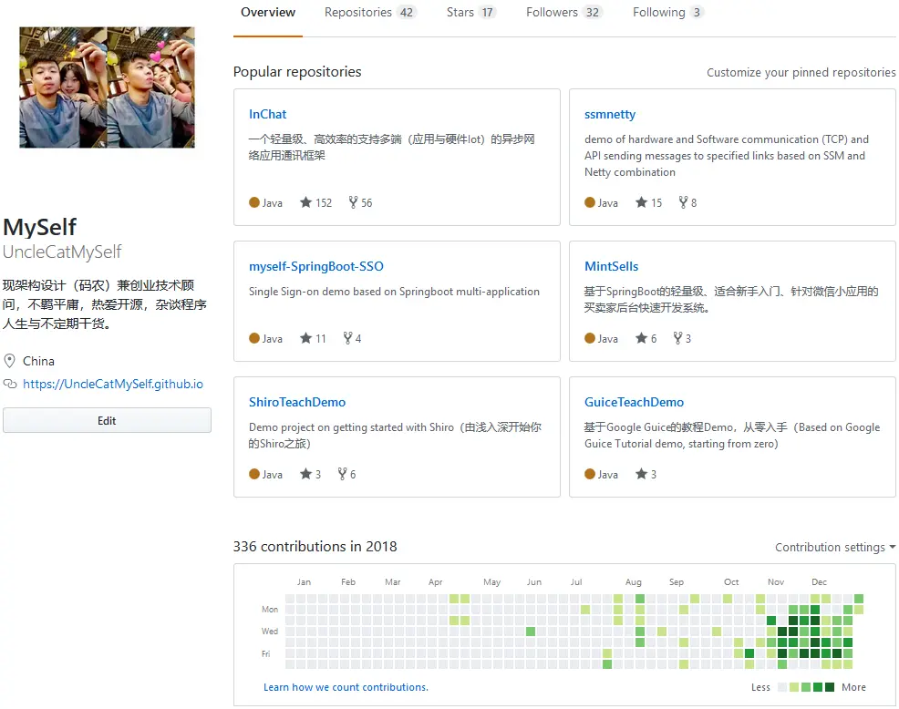 这里可能比较难做到每个人的适合做自媒体宣传角色,而且每个人的兴趣点不一样,猫叔之所以选择做自媒体是因为以前自学遇到很多坑,所以希望能打造一个平台,让大家一起来学习交流,同时做InChat框架也是因为想要为社区做出一点贡献,想想如果哪天自己一无所有的时候,我起码还有一个框架在为社区的开源者服务,如果你还没有GitHub账号的话,那么我强烈要求你去注册一个,这是一个开源的大千世界,什么语言的资源都有,只要你想到的,别人都已经做了一部分了。