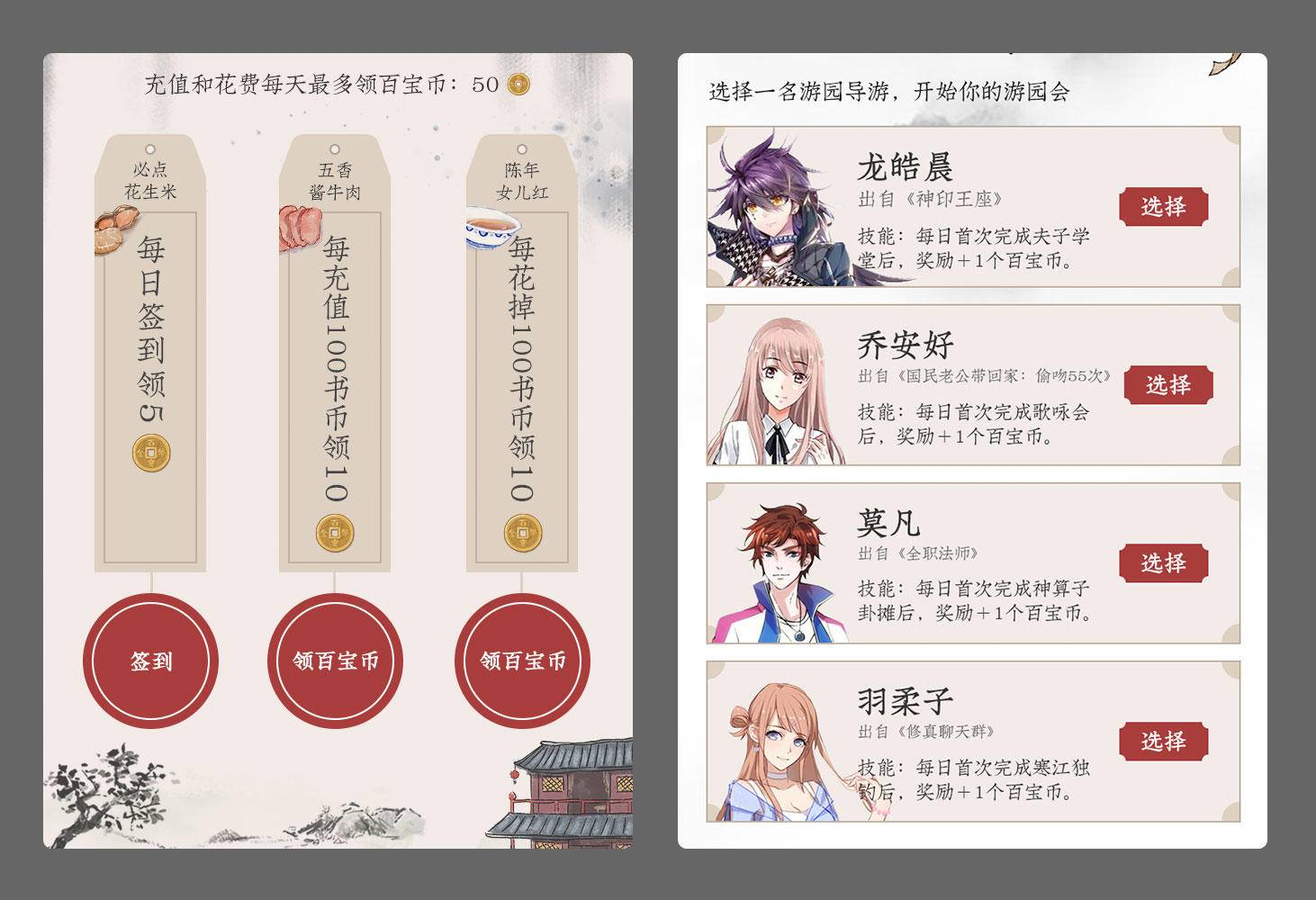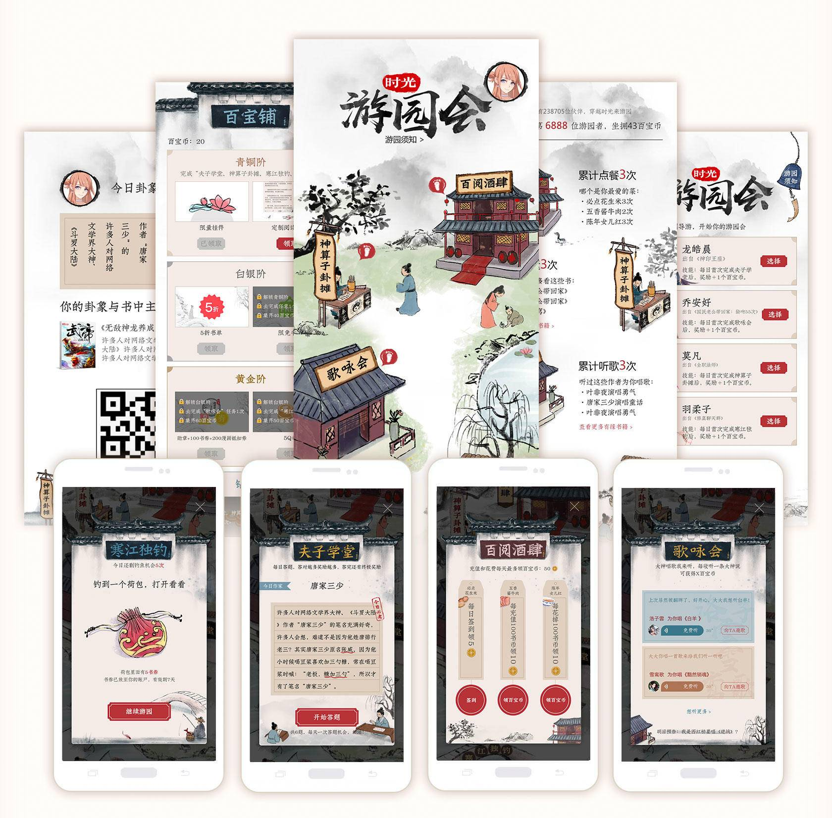 时光游园会是QQ阅读上半年的大型重点项目,以推广基础功能和提升社区渗透为目的。设计组需完成神算子卦摊、夫子学堂、寒江独钓、歌咏会、百阅酒肆、百宝铺六大模块的设计工作。