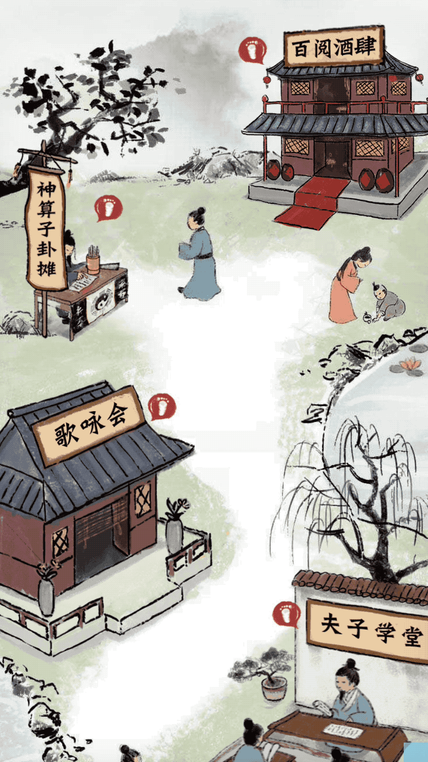 不只是我,相信在很多人的印象中,水墨感的设计大约都是上图中水墨笔触做为装饰或背景,用来塑造氛围。而在此项目中需要用水墨风格表现热闹的场景,其中的建筑和小场景要跳出整幅画面,提醒用户可点。以上水墨的用法恐怕无法实现。