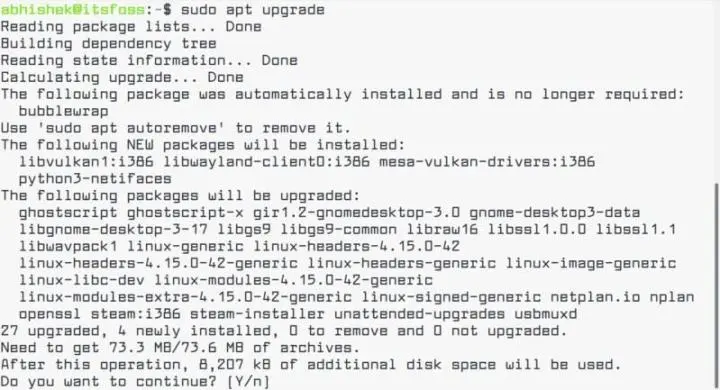 这条命令将已安装的软件包版本与本地数据库进行匹配。它收集全部信息,然后列出所有具有更新版本的软件包。此时,它会询问您是否要升级(已安装的软件包更新到新版本)。