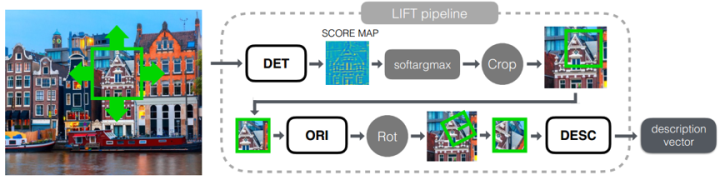 LIFT(Learned Invariant Feature Transform)由三个部分组成:Detector,Orientation Estimator和Descriptor。每一个部分都基于CNN实现,作者用Spatial Transformers将它们联系起来,并用soft argmax函数替代了传统的非局部最大值抑制,保证了端到端的可微性。