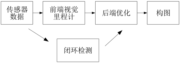 只利用相机作为外部感知传感器的SLAM称为视觉SLAM (vSLAM [2])。相机具有视觉信息丰富、硬件成本低等优点,经典的vSLAM系统一般包含前端视觉里程计、 后端优化、 闭环检测和构图四个主要部分[3]。