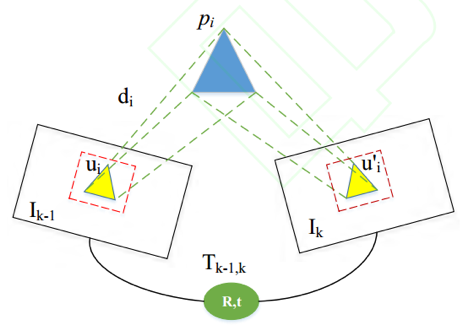 其中 ui 为 Ik-1 中任意像素点,它投影到空间点的坐标为 Pi, u′i是 Pi 投影到 Ik 上的坐标。之后利用中间层的数值来估计周围环境的三维模型和相机运动。
