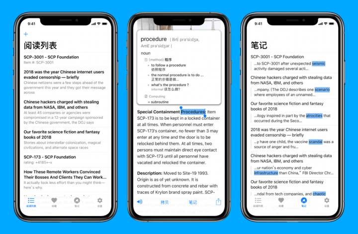 遇到不懂的单词,只需轻轻一点,你就能看到其详细释义,并聆听读音或添加笔记。极光阅读支持收藏、归档及多语种字典下载。如果你同时是 极光词典 的用户,还可以跨应用同步查词记录,在一处管理自己的学习进度。