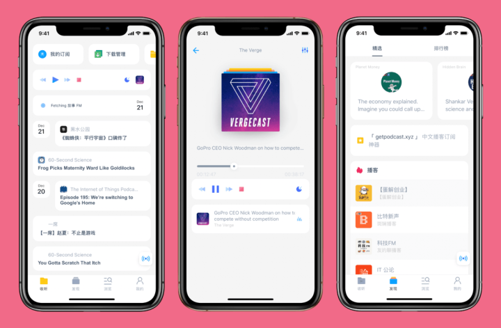 Moon FM 整体设计简洁素雅,但多彩的图标为其加分不少。与 Pocket Casts 不同,Moon FM 的首页以时间线方式呈现,帮你快速找到近期更新内容。你也可以通过上方功能区域管理订阅、下载、收藏、历史等。