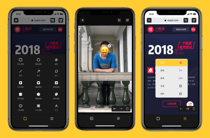 除了常见的画笔、线条、箭头、马赛克等之外,Pico 还有一个亮点功能,那就是人脸遮盖。选择该工具后,只需要在照片上拖动矩形选框,Pico 就会智能识别选择区域内的人物面孔,并添加马赛克或 emoji 遮盖,再也不用担心一觉醒来变成全国人民的表情包了。