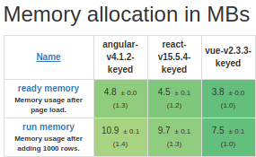如你所见,这个基准测试详细地说明了,相比于使用 React,使用 Vue.js 的网页应用程序占用的内存更少,运行速度也更快。