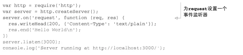 只要有请求过来,它就会激发回调函数 function (req, res) ,把“Hello World”写入到 响应中返回去。这个事件模型跟浏览器中对 onclick 事件的监听类似。在浏览器中,点击事件随 时都可能发生,所以要设置一个函数来执行对事件的处理逻辑,而Node在这里提供了一个可以随 时响应请求的函数。